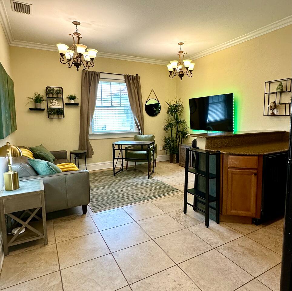 **Please note: We have added some upgrades to the space. The photos do not include the new pull-out sofa in the living room, the Roku smart TV in the bedroom, or the fire pit and grill outside. ** New photos coming soon! 🍳 Kitchen & Dining Fully equipped with everything you need to cook and dine in style Cooking basics: pots, pans, oil, salt, pepper, and spices Blender, toaster oven, microwave, stove, dishwasher, and freezer Coffee maker, hot water kettle, and wine glasses Dishes, silverware, and cleaning products provided 🛋️ Living Room & Work Space 65” smart TV with all popular streaming apps (Amazon Prime, Netflix, Hulu, etc.) High-speed internet and WiFi for seamless connectivity Pull-out sofa bed with extra pillows and linens Fold-away desk and chair for dedicated workspace—perfect for business travelers and remote workers Indoor fireplace for cozy nights 🛏️ Bedroom Plush queen-sized bed with luxury linens, and extra pillows & blankets Roku Smart TV Room-darkening shades for a restful sleep Clothing storage with hangers 👶 Pack ’n play/Travel crib available upon request (with sheets) 🚿 Bathroom Bathtub and hot water for a relaxing soak Shower gel, shampoo, conditioner, and body soap provided Essentials: Soft towels, toilet paper, soap First aid kit for peace of mind 🏡 Outdoor & Shared Spaces 🚗 Free parking on premises (located at the rear of the apartment) Private entrance leads to your living quarters 🌿 Courtyard: open space with outdoor furniture BBQ grill and barbecue utensils for outdoor meals Fire pit for cozy evenings 🧳 Luggage dropoff allowed for early arrivals or late departures 🏋️♂️ Fitness & Wellness Private gym: professionally designed, with exercise equipment and a sauna for a complete wellness experience ✨ Additional Amenities Small washer and dryer in the apartment Air conditioning and ceiling fans for comfort Free street parking is also available